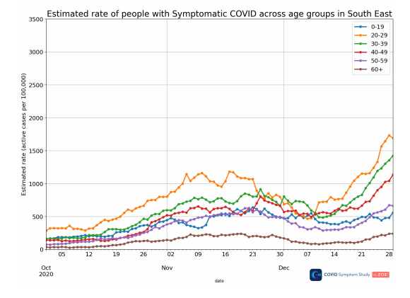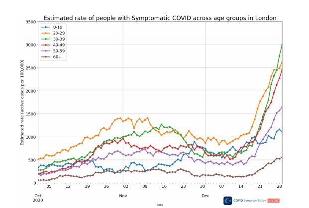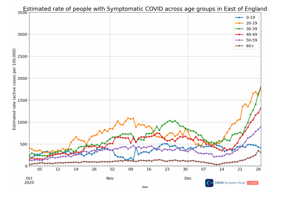 4. A large part of the rationale for closing schools again, in spite of the harm caused by closing them in the first lockdown, is that children are more susceptible to the new variant – including primary school children. But there’s little empirical evidence to support this claim. On the contrary, if we look at the ZOE app data showing symptomatic cases in the three regions said to be worst affected by the new variant – London, the South East and the East of England – infections appear to be relatively flat among those aged 0 – 19.