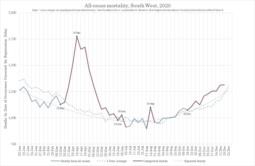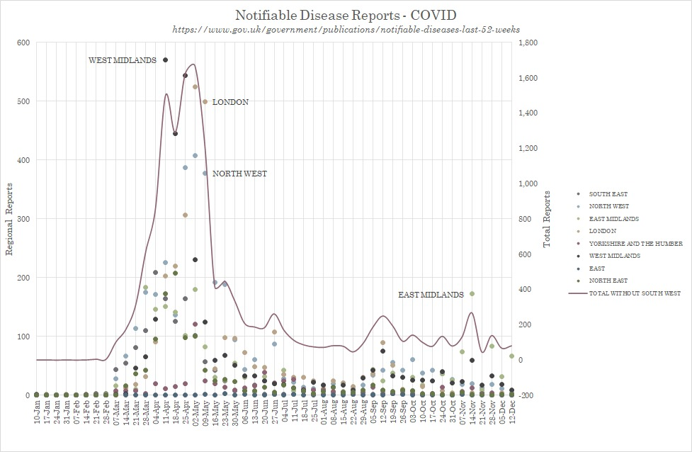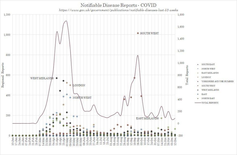 However, closer inspection suggests that the Autumn “2nd peak” of Notifiable Covid may in fact be an artefact which does not represent the true picture nationally, since nearly all the deaths notified during Autumn were in fact from the South West region, with the peak in that area reaching numbers beyond those seen for other regions in Spring.