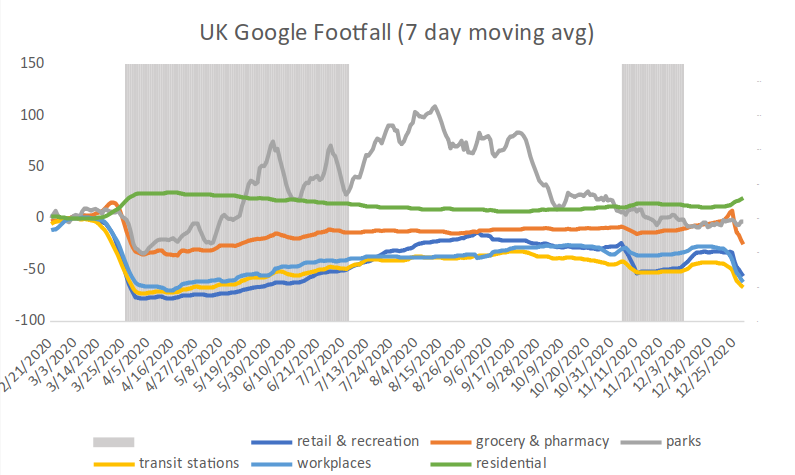 The effects of the first lockdown in March are profound. But the effects of the second lockdown in November? Not so much. We see a decline in ‘retail and recreation’ that was due to the pub and restaurant closures, but beyond that we don’t see much of an impact. The data shows that the instincts of lockdown sceptics – and anyone else who is actually paying attention – are correct: the second lockdown did not have much of an impact and so, the most likely explanation for the decline in cases is that it simply coincided with the imposition of the measures.