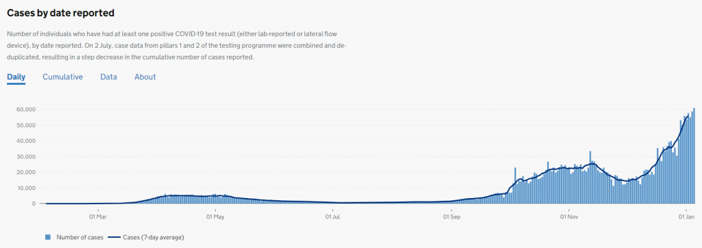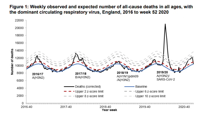 Deaths? Nothing out of the ordinary for winter. As PHE state in their most recent report: “In week 52 2020 in England, no statistically significant excess mortality by week of death… was seen overall”.