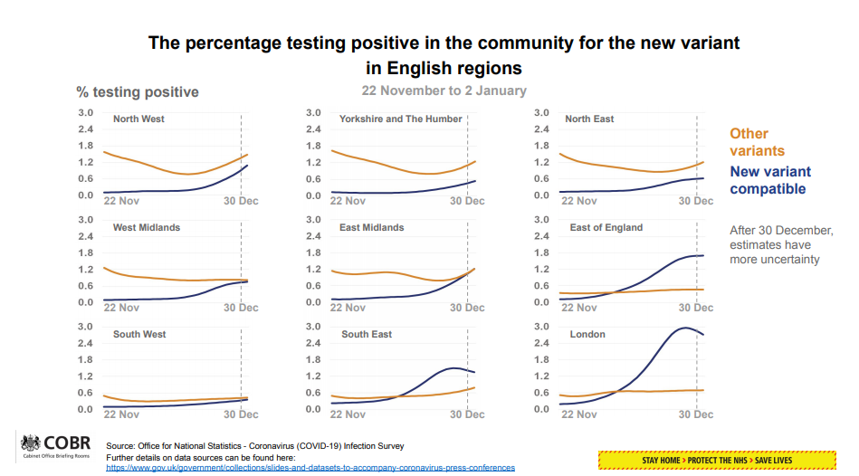 It might have something to do with the fact that the new variant has been declining in London and the South East since around Christmas, according to the Government’s own data presented at the press conference yesterday – despite Whitty claiming that the new variant is “taking off” in every part of the country.