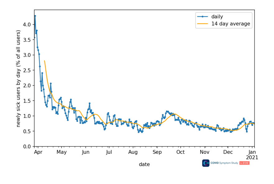 There are also the reports of Covid-like symptoms that users of the ZOE app send in each day, prior to any PCR tests being carried out. Like the other symptom-based data, these are largely flat since spring.