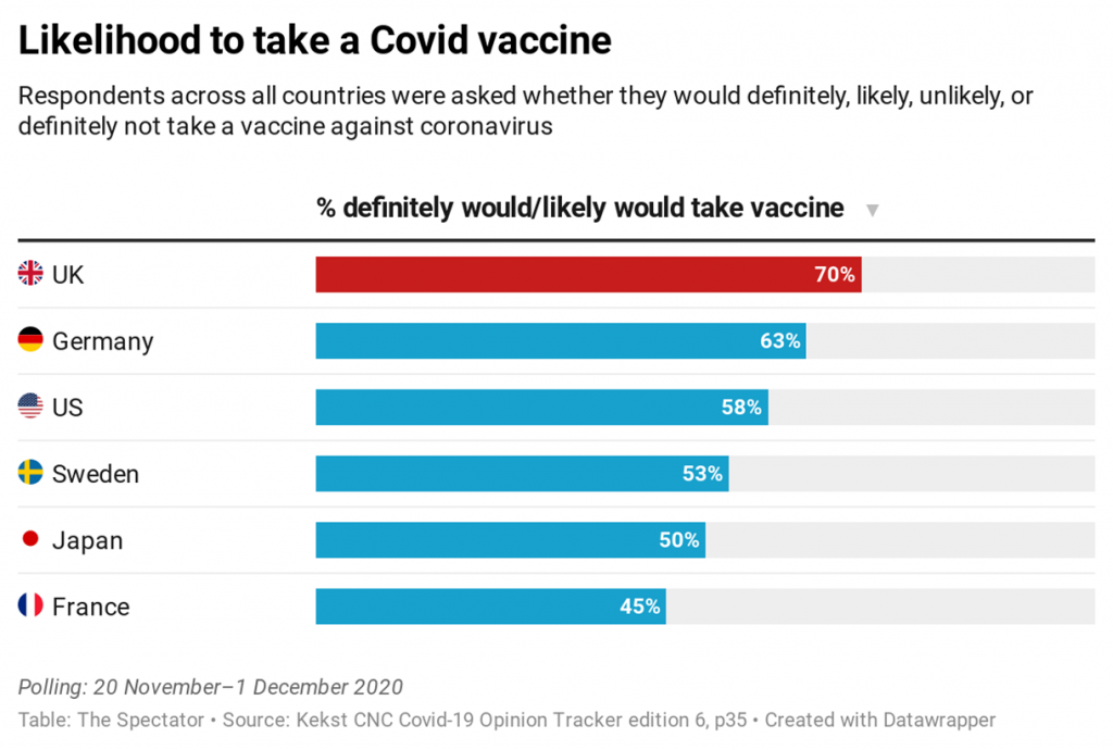 The UK leads the vaccine eagerness polls, but still nearly a third are reticent – and the true figure has to be higher. Forbes reports that in practice over half of front line workers in America have been refusing the vaccine, suggesting the 58% in the poll for the US is likely an upper bound.