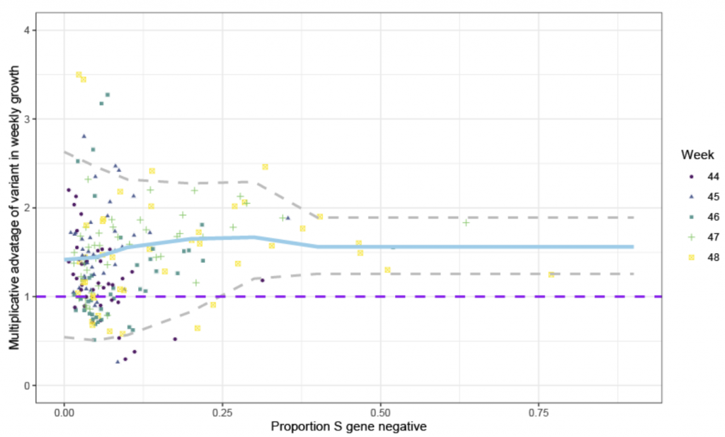 The Neil Ferguson/PHE study noted that during November (Weeks 44-48) tests that were positive for ORF and N but that were ‘S gene negative’ were both growing on average 70% faster than the more common variant (see blue line in Chart 2 below) and proliferating. Given the scatter plot, this doesn’t look like the most robust statistical conclusion to draw. However, of more concern is the fact that the growth rate of the S-dropout is being measured against the growth rate of the older variants, which itself appeared to be in decline (see Chart 1). The inappropriateness of this comparison is exacerbated by the differing geographical distribution, with the old variant predominantly found in the North of England and the new S-dropout variant in the South. If the Northern infection is naturally in decline and there is a new infection blooming in the South, we would logically expect the growth rate of the old variant to be slowing (R < 1) and of the S-dropout to be accelerating (R > 1). If so, then comparing the two would naturally yield a faster growth rate for the S-dropout because both variants would be at different stages of their epidemic cycle (Gompertz curve). Crucially though, this would not necessarily imply that the S-dropout was any more, or less, transmissible than its predecessor.