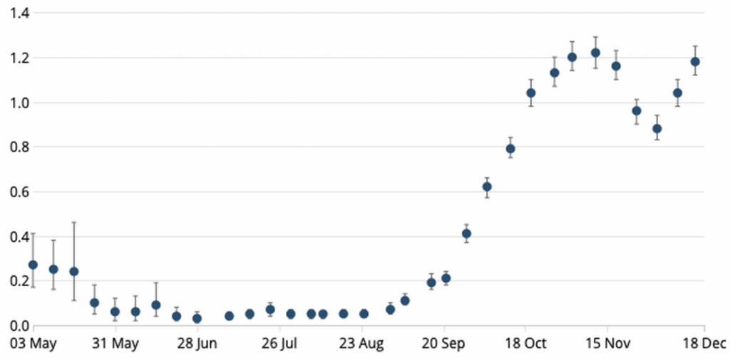 How therefore, if increased transmissibility is not the culprit, to explain the surge in new positive tests, which reached 57,725 on January 2nd? The most salient point to make is that the number of tests carried out has leapt by +50% since early November. With a largely asymptomatic disease like COVID-19, the more absolute tests carried out, the more absolute positives are returned, especially when the authorities target testing capacity at the newest outbreak areas. There were 445,000 daily tests in the week to December 21st (the most recent data available at time of writing) and 36,410 a day came back positive (a positivity rate of 8.2%). If, for example, we compare that to November 4th, the day before lockdown, the 7-day average number of daily tests was 298k and the average number of positives found each day that week was 23,763 (8.0% positivity). So, there has been no real change in positivity, despite the leap in “new cases”, not least because there has been no real change in disease incidence either, which is still ~1.2%, the same as its pre-November lockdown peak, having bounced back after restrictions were lifted on December 2nd (see Chart 3 below). What there isn’t is any sign of though in this data, is any increased transmissibility.
