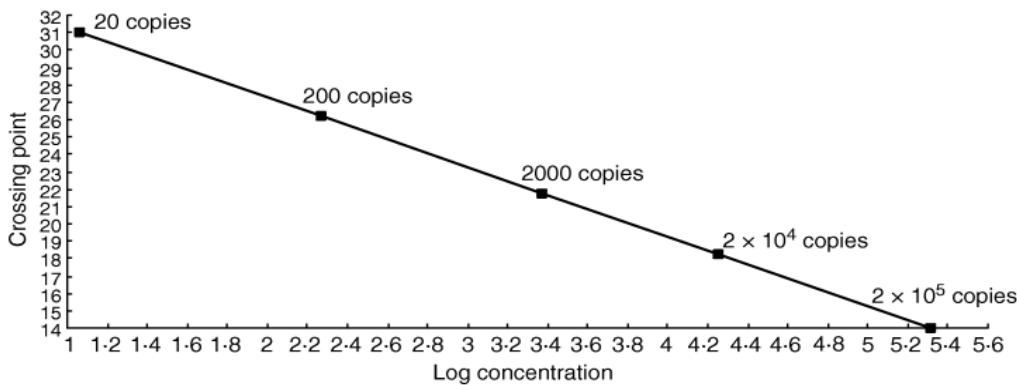 How much initial virus a Ct number represents is determined by calibrating the process using a series of increasingly dilute samples with a known number of viral copies. Chart 5 below shows that in the case of norovirus, for example, if amplification needs to be taken as high as 2 billion to get a positive, only about 20 initial copies of the virus RNA are being detected, crossing the threshold at 31 cycles (Ct 31). However, with fewer than 20 initial copies, the PCR becomes unreliable, no matter how many cycles are performed. Therefore, the LoD for the Norovirus PCR test is 20 viral copies per sample at Ct 31. Like the coronavirus, norovirus is a positive-strand RNA virus, so the PCR process is very similar. The chart plots 10:1 dilutions against the Ct at which the sample tests positive and falls, as is to be expected, along a straight line (logically, you shouldn’t be able to dilute something by a factor of 10 and get a stronger Ct signal). This sort of calibration curve is useful because the Ct for any unknown sample can be traced on the line and the corresponding amount of norovirus can be read off on the x axis.
