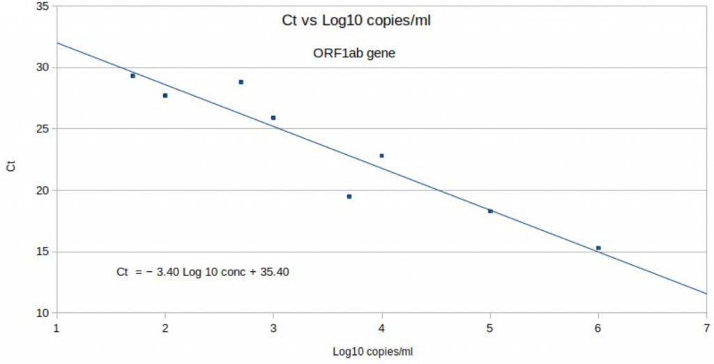 Birmingham Uni generated a calibration curve to compare Ct and viral loads for the PCR protocol. PCR machines output data by measuring the number of amplification cycles before a positive signal is seen (Ct). High numbers of cycles get more sensitive, detecting smaller and smaller amounts of DNA, but there exists a point when the output of the PCR machine no longer reflects the number of initial copies of the target gene, this is known as the limit of detection (LoD).