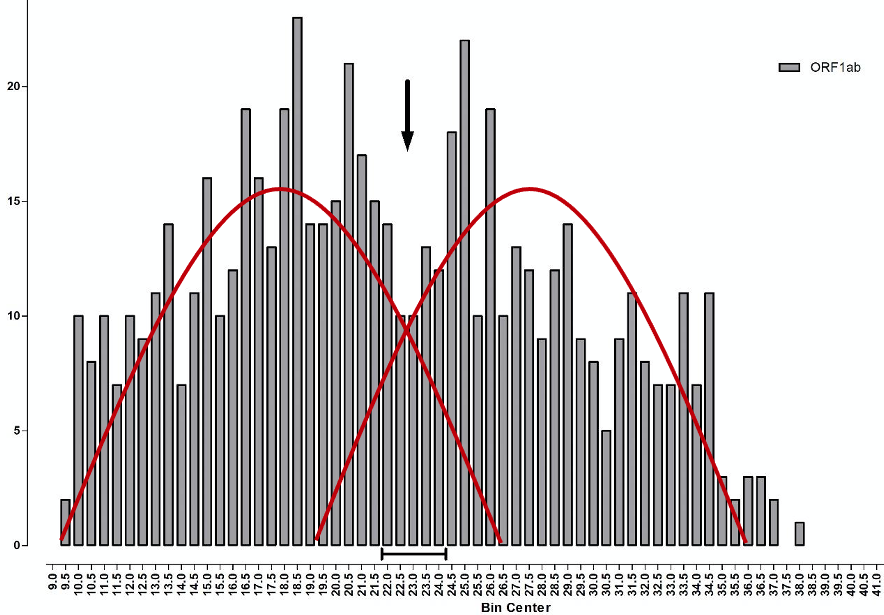 More precisely, what we have here is a biphasic distribution, the result of two fairly normal distributions overlaying each other (illustrated by the red curves on Chart 8 below). The one on the left, with its peak around Ct 17-18, is the distribution of new ‘live’ infections, whilst the distribution on the right, with a peak around Ct 27-28, reflects past cases that can only be identified following high Ct amplification. The observed trough between the two, from Ct 22-24 and marked by the arrow, indicates where the two viral distributions, new and old, overlap each other.