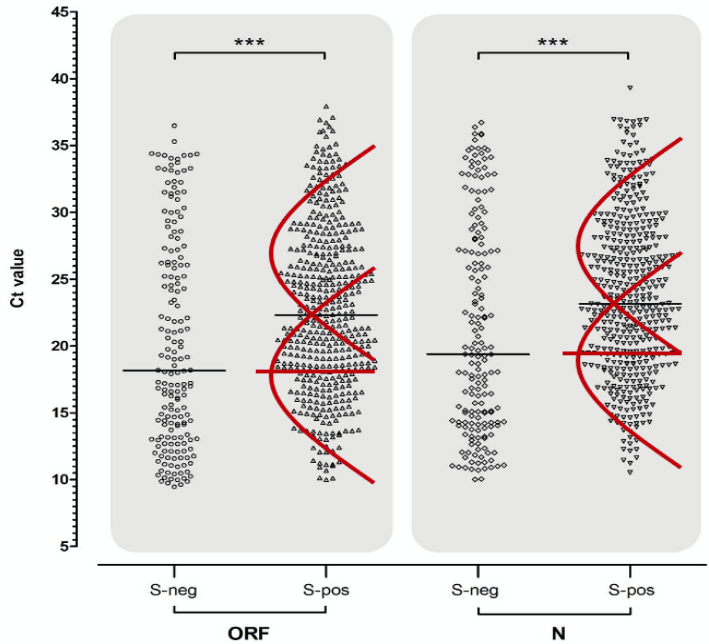 - The median Ct of samples positive for ORF and N but not the S gene is lower than the median Ct of samples also positive for S.