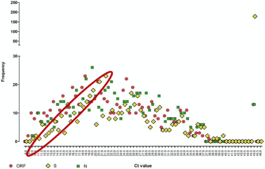 Of the 641 positive samples analysed, 178 (28%) had an undetectable S gene profile, which they artificially assigned a Ct of 45 (see yellow diamond, top right-hand corner of Chart 10 below). This compares to only 13 positive samples (2.1%) with an undetectable ORF (red circles) and another 13 with an undetectable N gene (green squares). The researchers jump to the conclusion that these missing S gene positives and their lower median Ct (which they forgot could have been caused by the multiphasic nature of the distribution) lead to “a conservative estimate of a significantly larger population of infectious subjects that have an increased viral load up to 10,000-fold higher” with commensurately increased transmission. The rest, as they say, is history.