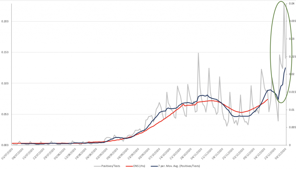 The UK government has explicitly tied the transmissibility of the new S-dropout variant (despite its existence being traced back to early October) to the very recent surge in new cases, which hit a record high of 80k positives on December 29th. Thus, 11 days after the disease prevalence was estimated to be < 1.3% of the population, and 9 days after a quarter of the population was put under Tier 4 lockdown, 23.2% of all people tested by pillar 2 came back positive (see grey line and green ellipse on Chart 11 below). Note that as with December 29th all the spikes in the data are Mondays, because testing capacity is redirected to new hotspot areas each week; but even the national 7-day average positivity had risen from sub-8% at Christmas, to 13% by NYE. This has all been driven by London, where 7-day positivity was 14.9% on December 20th, the day of Tier 4 lockdown, but nevertheless had risen to 17.8% on Christmas Day and is now 26.8% (20x higher than prevalence). How and why is too early to tell.
