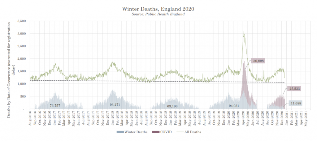 Figure 1 shows the sharp spike in excess deaths seen with epidemic Covid in spring. These deaths were in excess of the usual winter hump. Compared with previous years, this year’s winter excess deaths started earlier but the shape of the curve is consistent with previous years. However, we have now reached the bizarre situation where so many deaths are being labelled as caused by Covid that, for the first time ever, this winter there are fewer non-Covid deaths in winter weeks than there were in summer.