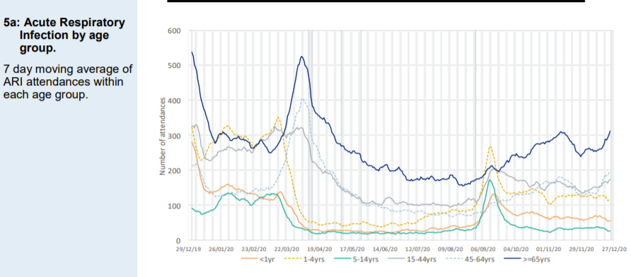 Figure 2: Attendances at Accident and Emergency for an acute respiratory infection (which includes those categorised as Covid-like). Attendance levels at the end of December 2020 are lower than for 2019 (left of graph) for every age group.