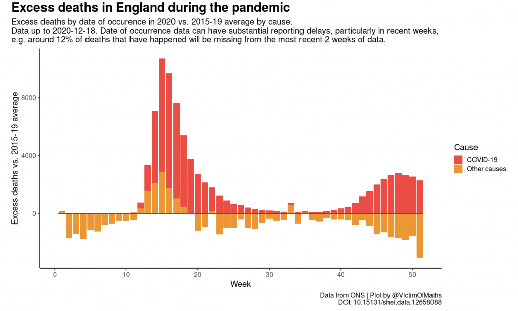 Figure 3 Spring excess Covid deaths were accompanied by excess non-Covid deaths as we restricted access to healthcare. However, every increase in autumn excess Covid deaths has been mirrored by a fall in non-Covid deaths.