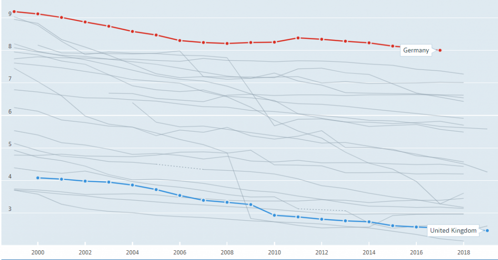 Figure 4 Hospital beds total per 1,000 inhabitants 1999-2019. Data from OECD.