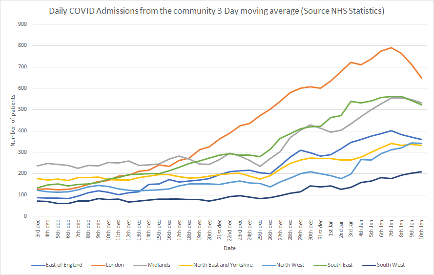 1. Admissions from community falling over last four days. NB this cannot be attributed to lockdown starting on January 5th – more consistent with ZOE app data [see below].