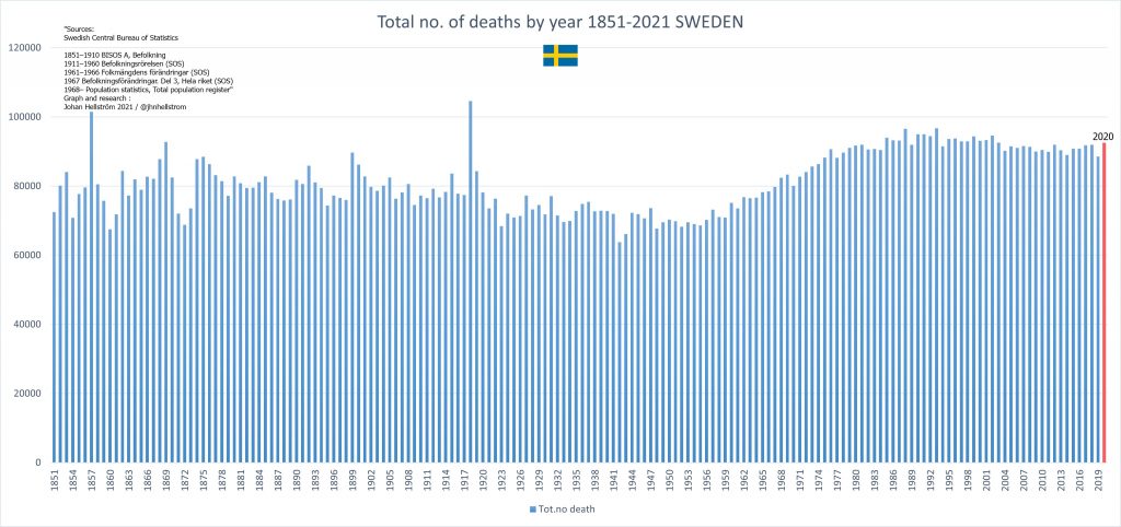 As Lockdown Sceptics reported yesterday, 2020 in Sweden was scarcely more deadly than 2017 or 2018. Furthermore, 2019 was so mild that 2019 and 2020 added together had fewer deaths than 2017 and 2018 added together – and this is before any adjustments for age or population size. In other words, no real excess deaths at all, as this study from the University of Oslo concluded, putting the 2020 extra deaths primarily down to “mortality displacement” or “dry tinder” from 2019.