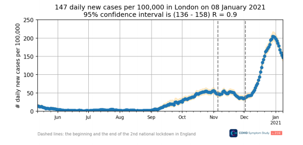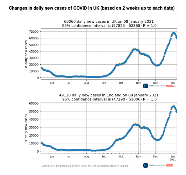 The Daily Mail asks “Did England pass its peak before lockdown?” That’s certainly the impression the ZOE Covid Symptom Study App gives, with the peaks in the UK and England around January 2nd and in London around December 28th.