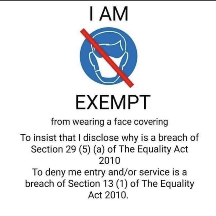The government made the question of exemption one of self determination for a good reason. It is so they could not be accused of contravening Disabilities Act etc. They can argue that if anyone felt they couldn’t wear a mask it was left to the individual to choose between their needs and their conscience. Of course, if they had actually come out and said that, the whole thing would have fallen apart as nobody would have worn one. Luckily for them, the average member of the public hasn’t the intellect or desire to read between the lines of legislation and find out what their entitlements are.