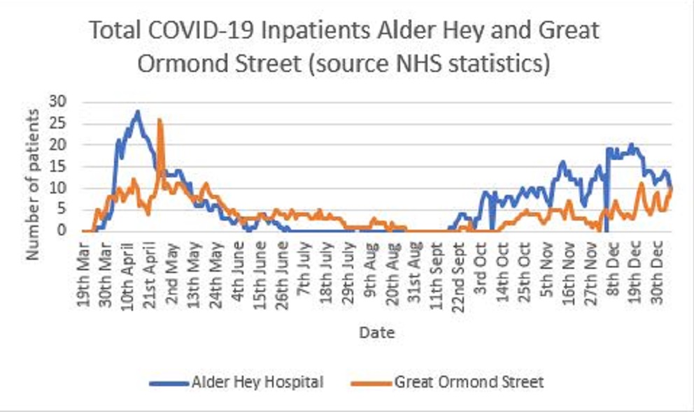 Graph 1 shows the number of COVID-19 inpatients at two leading children’s hospitals. Great Ormond St in London and Alder Hey in Liverpool. The graph shows that there are fewer children in both hospitals in the winter than in the spring. The overall numbers are low, fewer than 30 at the spring peak, fewer than 20 in the winter. Great Ormond Street in particular has seen very low numbers of children ill enough with COVID-19 to warrant admission this winter.