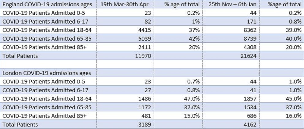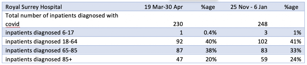 Table 5 is a comparison of the age stratified COVID-19 diagnoses at the Royal Surrey Hospital between comparable six week periods in the spring and winter. The data is contained in the monthly summary of NHS COVID-19 activity published on January 14th. The figures show a slight increase in the percentage of patients over 85 years in the winter compared to the spring. There is no significant increase in patients in the younger cohort 18-64. Unfortunately, the NHS figures do not allow a more detailed analysis of this wide age band, so it is possible that within the 18-64 cohort, the numbers could be skewed to the younger side. Publication of local audit figures would be informative.