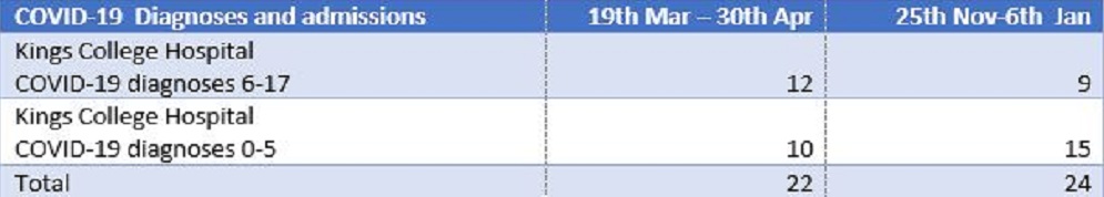 Table 1 shows the total number of COVID-19 diagnoses made on children at Kings College Hospital in two comparable six week periods from the spring and the winter. There is no significant difference between the two periods. Twenty four patients admitted over six weeks with short lengths of stay does not constitute a “ward full” of patients.