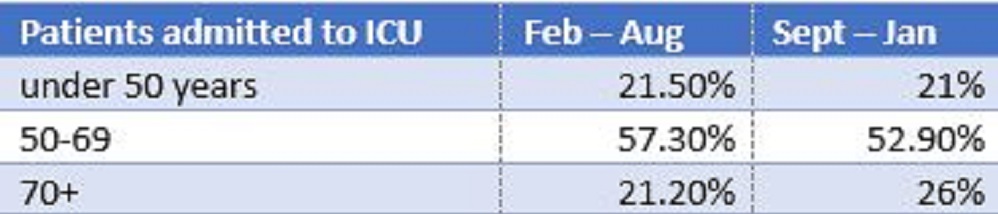 In the paper the age groupings were quoted slightly differently to the raw data from the cohort of patients from September to January, so I have aligned the information enabling a direct comparison between the ages of ICU patients in the spring and the winter in Table 3. The only difference is a skew to the older age group in the winter. The data reported in the literature from ICUs in other European countries are broadly comparable with the UK ICNARC figures.