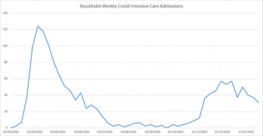 The winter surge is currently in decline in Sweden, and was in decline prior to the new restrictions coming into effect on January 10th. ICU admissions have been declining sharply across the country since the week beginning January 4th, and in Stockholm, which was hit hard in spring, ICU admissions stopped rising at the beginning of December and have declined since (see below).