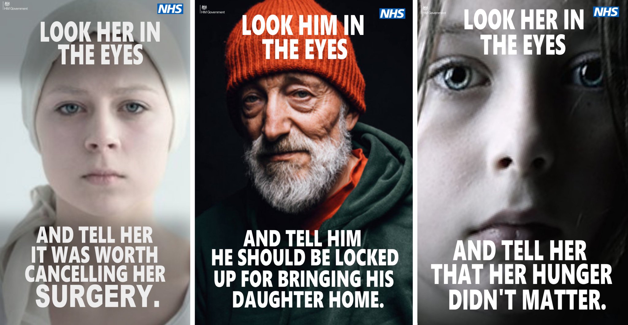 Does the Governments and NHS “Look them in they eyes…” poster campaign fit any of the above? A resounding NO! Their campaign is one of blame and division. They have chosen to set one group against another. There is the victim group, this is the sick virus sufferer. They are portrayed as the innocent victim whom someone else has done a terrible thing to.