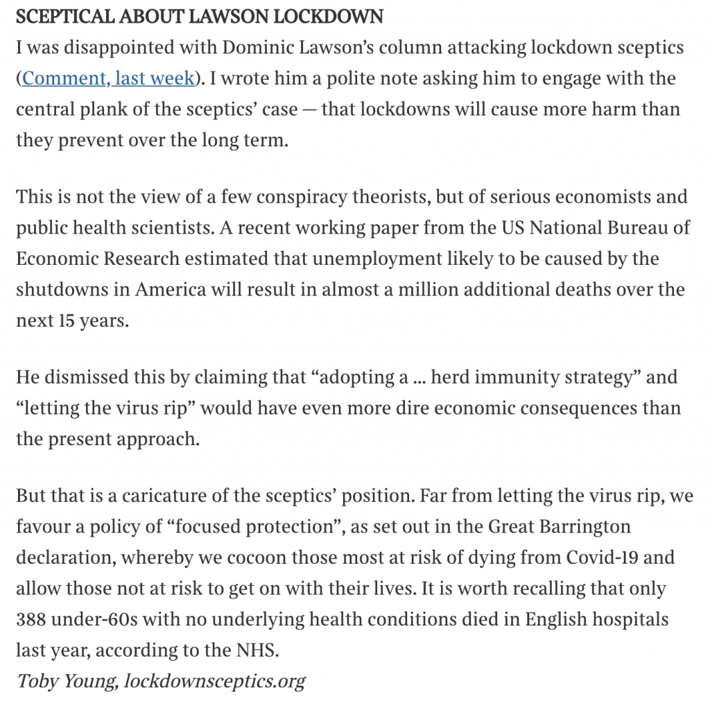 First to the article itself entitled “Rise of the Coronavirus Cranks.” Mr Snowdon is at liberty to write whichever article he chooses. However, his article might more appropriately have been entitled “My problem with Ivor Cummins and Mike Yeadon” or “My problem with social media Covid deniers” as it seems the bulk of his article focused on a detailed rebuttal of claims made by these two individuals and by extension those he categorises as “Covid deniers”. While he states from the outset that he wishes to focus on “the most extreme variant of lockdown scepticism”, he proceeds to argue on the basis that this “extreme variant” as he puts it is paradoxically the dominant form of scepticism as exemplified by the twitter/social media world he inhabits. If that was not Mr Snowdon’s intention then I accept any inadvertent omission on his part. Unfortunately his article will have been seized upon by all lockdown advocates as being evidence of the general ‘crankiness’ and eccentricity of the lockdown sceptics’ cause. Nor sadly am I convinced that the subtle and nuanced conflating of multiple variants of lockdown-scepticism was entirely innocent – not just on the part of Mr Snowdon, but by multiple other commentators who have sought to attack lockdown sceptics.