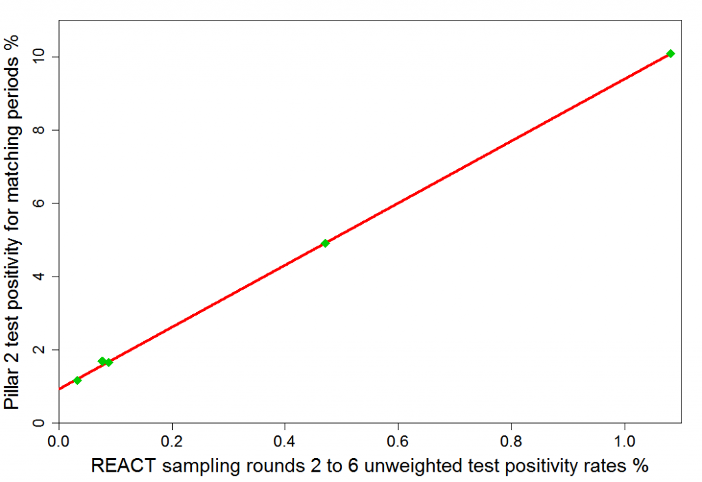 One can use this very tight statistical relationship and the very low REACT false positivity rate to derive good estimates for the false positive rates in Pillar 2 testing. Those estimates increase only marginally with the assumed false positive rate for REACT testing. The REACT false positive rate, while unknown, must be positive and not more than 0.033%. I make the neutral assumption that it is half that level. The implied false positive rate for Pillar 2 testing then fluctuates in a narrow range just above 1.0%, from late June until Lockdown 2. So, while there are obviously uncertainties in this estimate, Yeadon’s assumption of a 0.8% Pillar 2 false positive rate appears if anything to be on the low side.