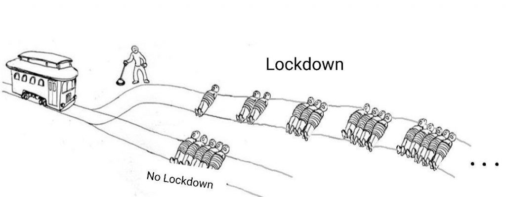 Such abstract scenarios may seem irrelevant to real life. We certainly never expect to find ourselves in situations like the one described above – we don’t live in a world where people are frequently tied to train tracks, or where runaway train carriages can be stopped by pushing fat men off bridges. But the point isn’t to understand how we would behave in this particular situation, but to understand how we should behave when analogous situations arise in real life. And, in fact, we have such a real life situation to which such considerations can be applied. Lockdown.