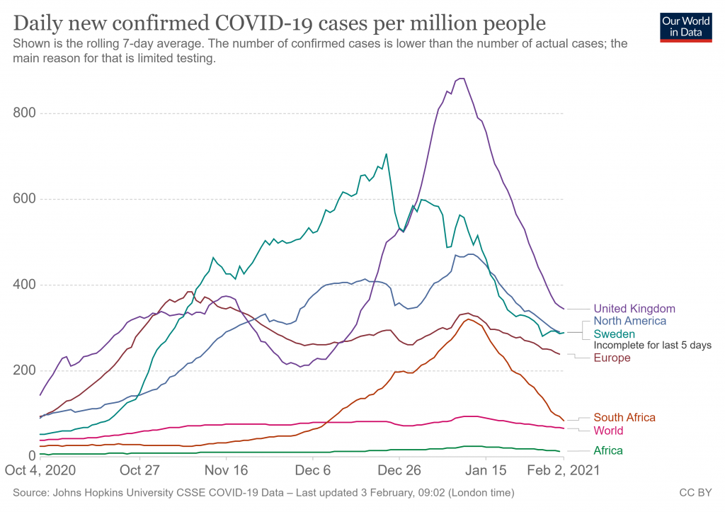 While not every country in the world conforms to this pattern, enough do for it to be seen as a global phenomenon. There is no indication here that the UK and South African variants are prolonging the crisis in those countries.