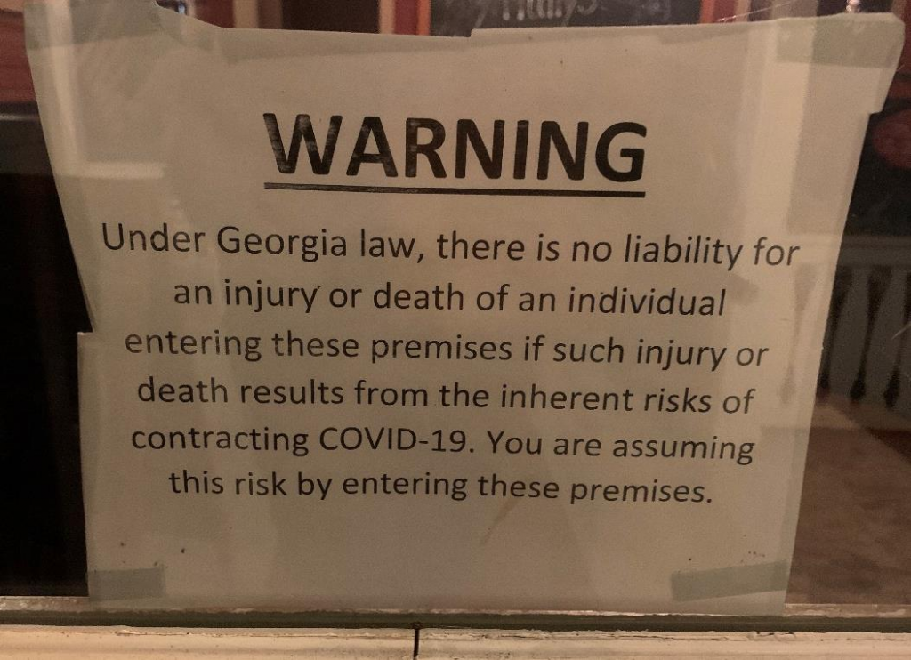 We very much appreciated Helen’s approach to restrictions or lack thereof. The photo of the signage tells it all – each individual is responsible for the risks they take, and Georgia will not allow you to blame someone else! I remember seeing a couple that were obviously on break from working standing on the sidewalk smoking cigarettes with masks around their chins. Better save yourself from inhaling the Chinese virus but who cares if you give up smoking!