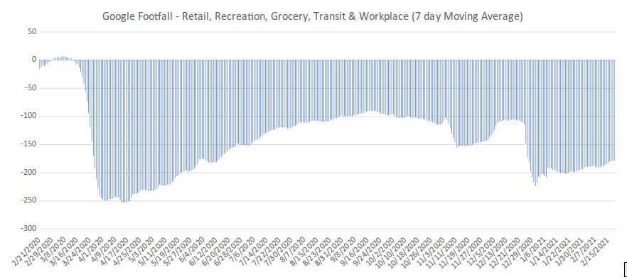 The true impact of the lockdown on this chart troughs on the 19th of January. But because of the holiday season people stop moving around as much on the 25th of December and the decline in footfall troughs on the 31st of December.