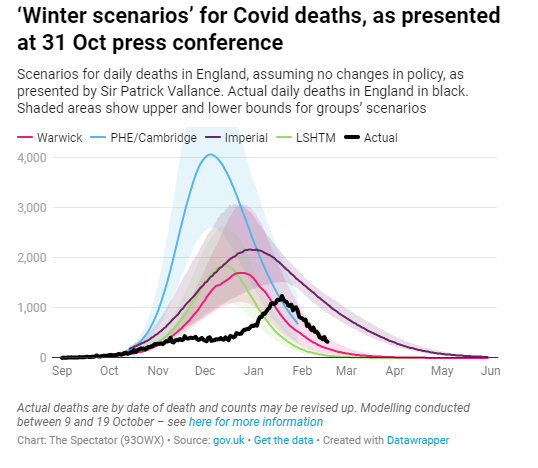 The assumptions are therefore very similar and the conclusions are only slightly less gloomy. Like Warwick, they predict a massive summer wave and 130,800 dead even under their most optimistic scenario.