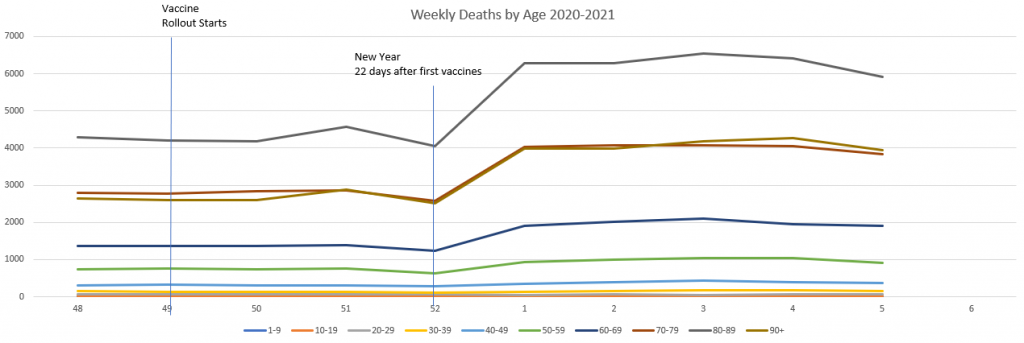 So you would expect that 22 days after the first jab (so from December 30th 2020) there would begin to be a significant fall in deaths for the 70s, 80s and 90+ age groups.
