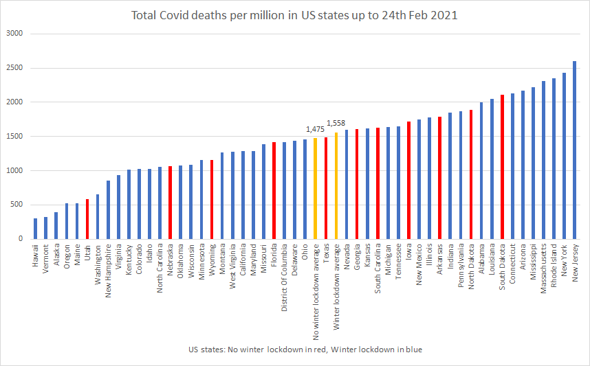No-lockdown states in America continue to outperform lockdown states this winter, with 1,475 Covid deaths per million in states which didn’t lock down this winter (seven of them didn’t lock down in the spring either) compared to 1,558 deaths per million in states which locked down in winter (all of which locked down in spring as well).