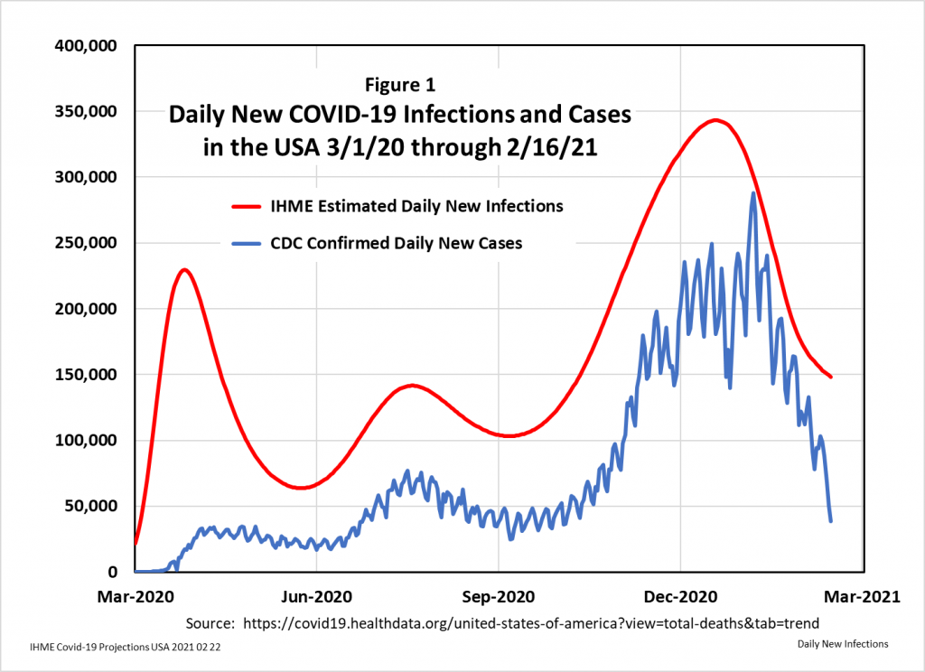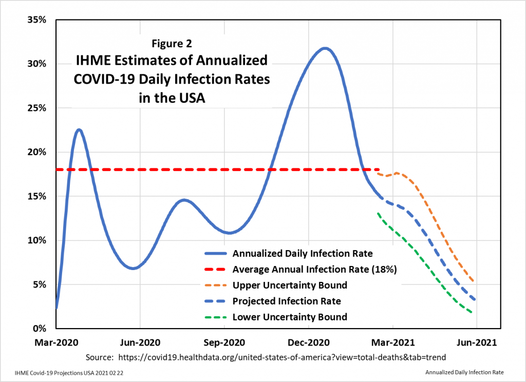 Figure 2 shows the daily ACIR for the period March 1 2020 to February 16 2021, along with IHME’s projection of ACIR to June 1 2021. As the chart indicates, the ACIR varied, with high points in April, August, and January, and low points in May and September.