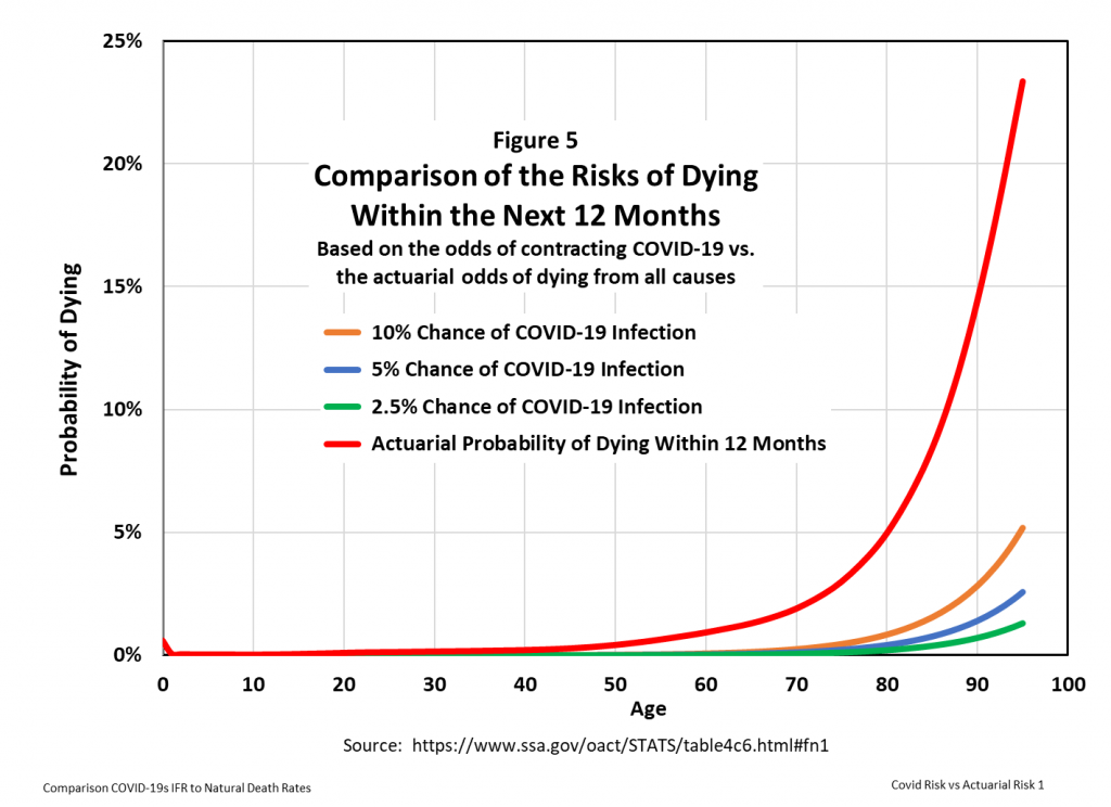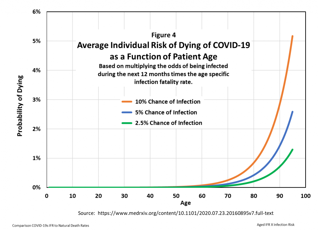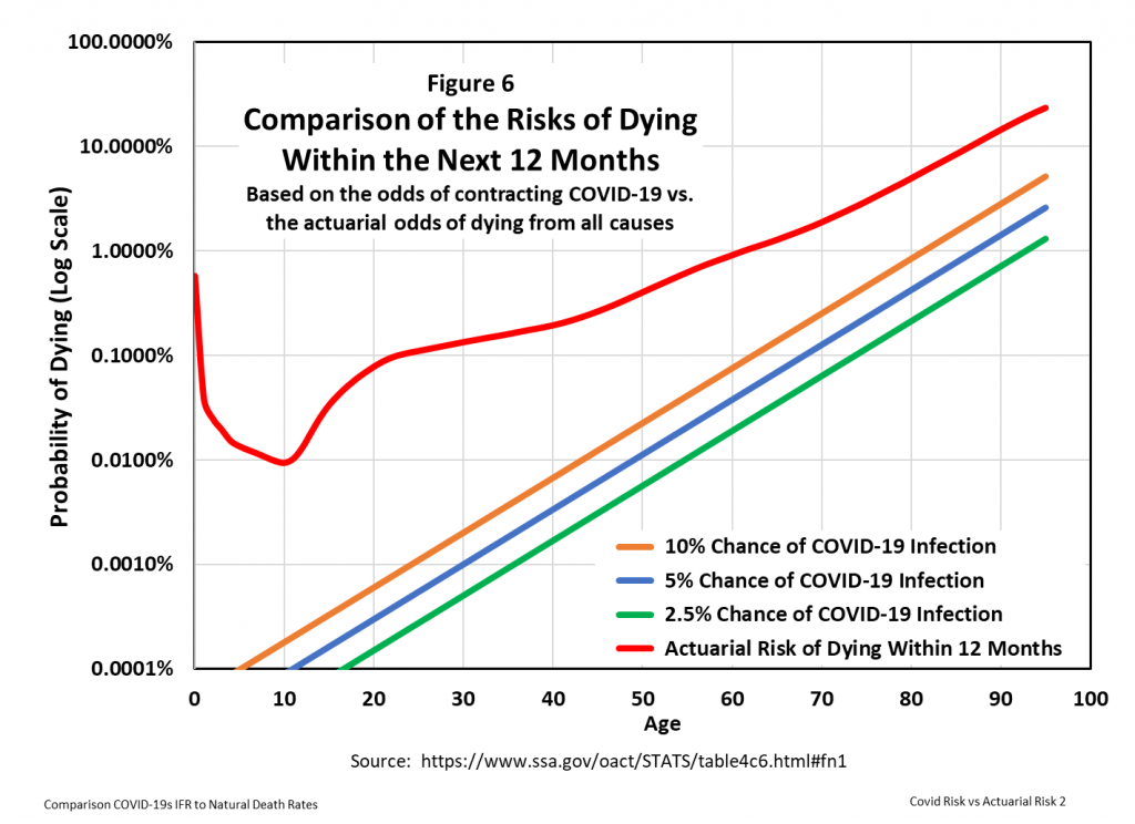 Figure 6 indicates that, at an ACIR of 5%, the probability of dying of COVID-19 within the next twelve months is at least one log factor less than the probability of dying from any cause for all ages up to about 90 years.