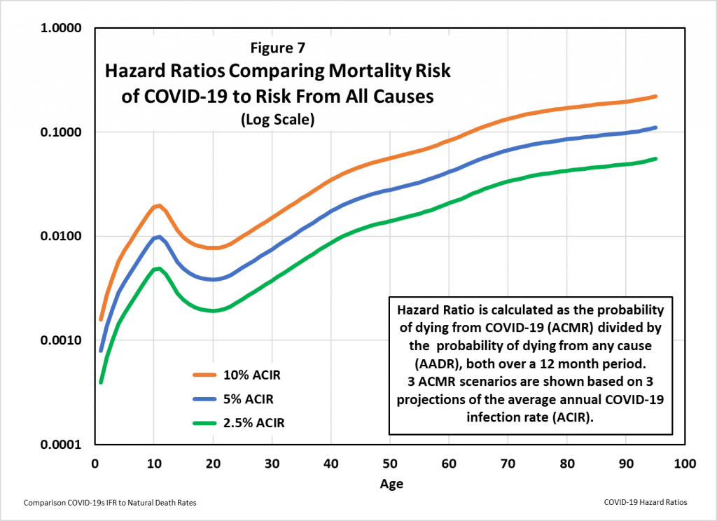 This difference can be measured as a hazard ratio, which in medicine is a comparison between the probability of events in a treatment group, compared to the probability of events in a control group. In Figure 7, the ‘treatment’ group measures the risk of dying from COVID-19, and the ‘control’ group measures the risk of dying from all causes excluding COVID-19. (This exclusion is strictly true, since the AADR data were developed prior to the onset of COVID-19, and therefore do not include the additional mortality risk from COVID-19.)