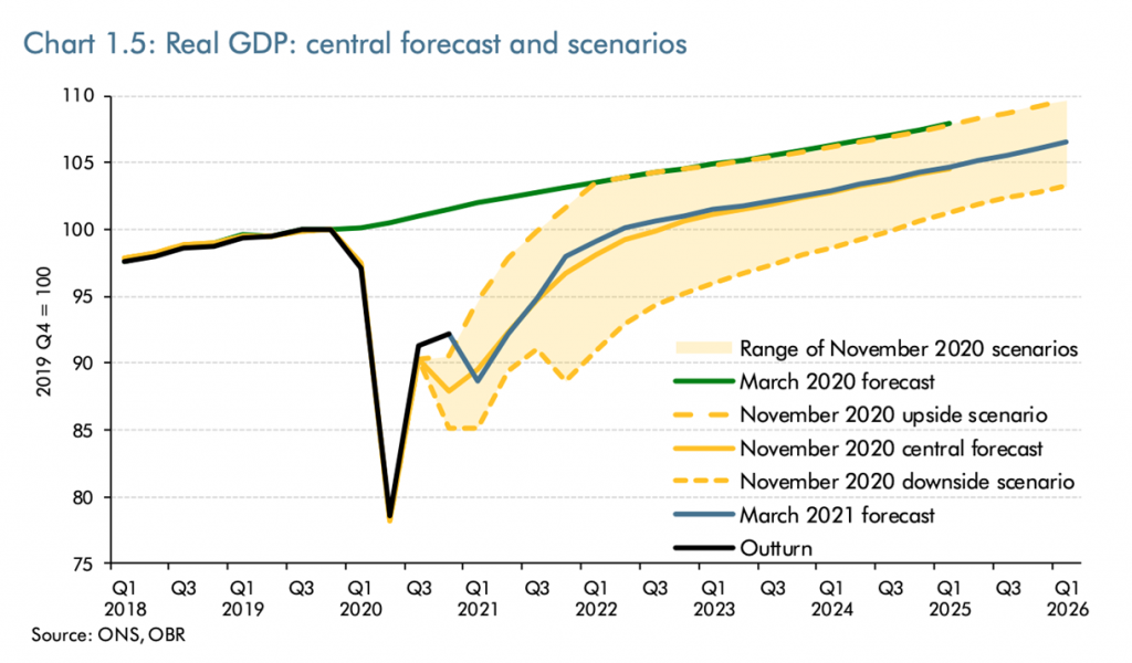 What does this mixed bag of policies mean for the UK’s economic recovery? The good news out of today’s Budget was an update from the Office for Budget Responsibility, which has moved forward its most recent forecast for GDP to return to pre-pandemic levels. This is now expected to happen in the middle of next year.