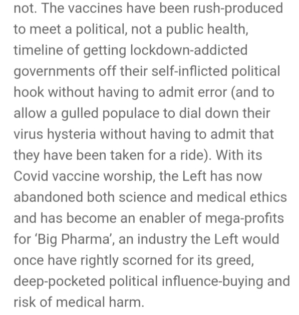 The Left got off on the wrong foot by misrepresenting Covid as much more scary than what it actually is i.e. a bad-to-ordinary flu season. The Left has joined the lockdown establishment elite in inflating the risk posed by the SARS-CoV-2 virus by (1) lumping together deaths ‘with’ and deaths ‘from’ Covid; (2) conflating positive virus test results – including false positives – with actual clinical cases; (3) ignoring Covid’s fatal attraction almost solely for the already-ill elderly whilst being fairly innocuous to everyone else; (4) portraying the virus as a constant menace despite its cyclic behaviour as just another recurring, seasonal, warmth-shunning, mutating respiratory virus which naturally peters out during its summer recess; (5) deep-sixing the fear-quelling concept of naturally-acquired herd-immunity including pre-existing cross-immunity from other coronaviruses, both cornerstones of immunological and virological science; and (6) ignoring the fact that Covid was the plague that never was because it had been circulating globally, courtesy of the vast international Chinese tourist trade, since as early as September-October 2019, with nobody noticing anything statistically out of the ordinary in overall death rates prior to the March Madness triggered by panicky politicians in 2020.