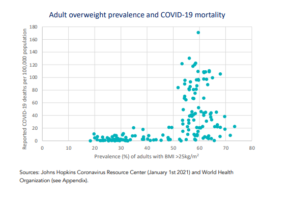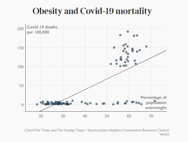 No country where less than 40% of the population is overweight has Covid death rates above 10 per 100,000, while no country with death rates above 100 per 100,000 has overweight rates of less than 50%.