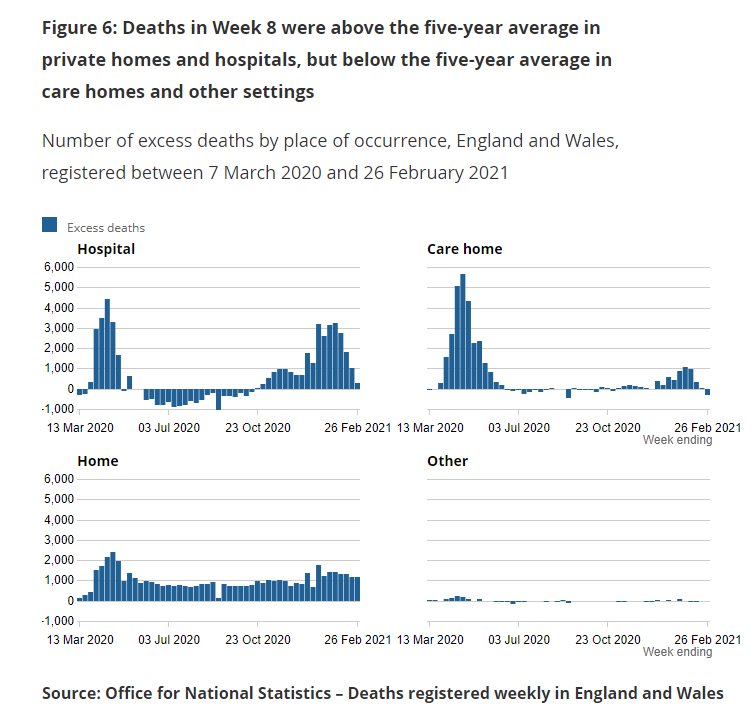 Deaths in private homes on the other hand were still a huge 44.2% above the five-year average (1,147 excess deaths). There were 238 deaths involving COVID-19, leaving 909 non-Covid excess deaths (if we make the generous assumptions that all Covid deaths are excess). That’s nearly 80%.