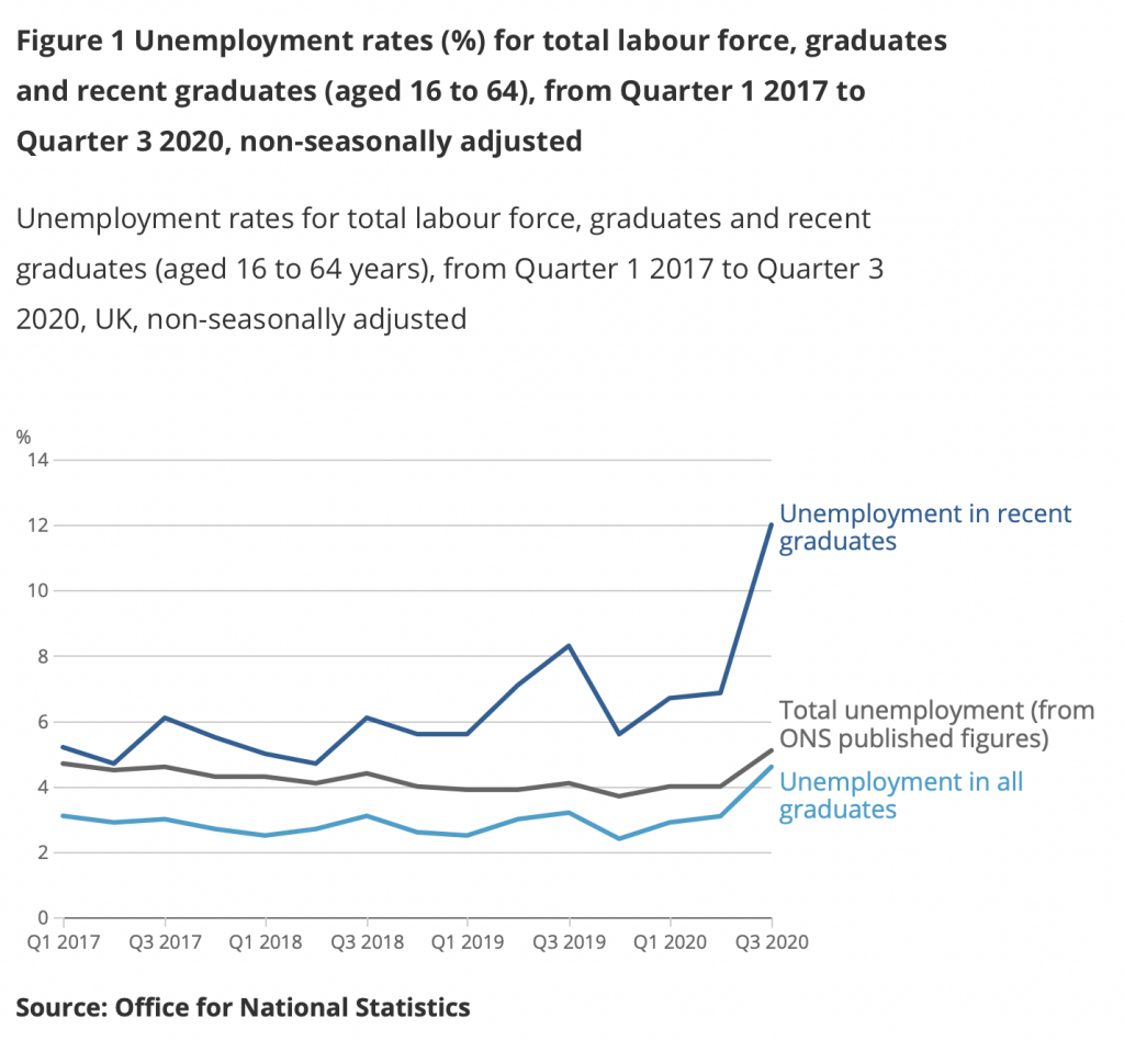 A report by the ONS has found that unemployment for recent university graduates reached 12% in the third quarter of last year, following months of Government-imposed lockdowns. Here are the key findings: