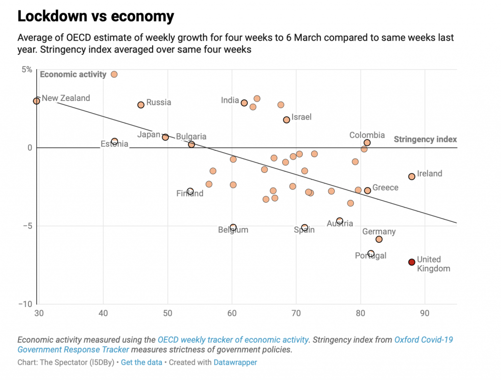 The UK’s economy is suffering worse than others because of the strictness of its lockdowns, new data shows. Kate Andrews has written on this well-established relationship in the Spectator.