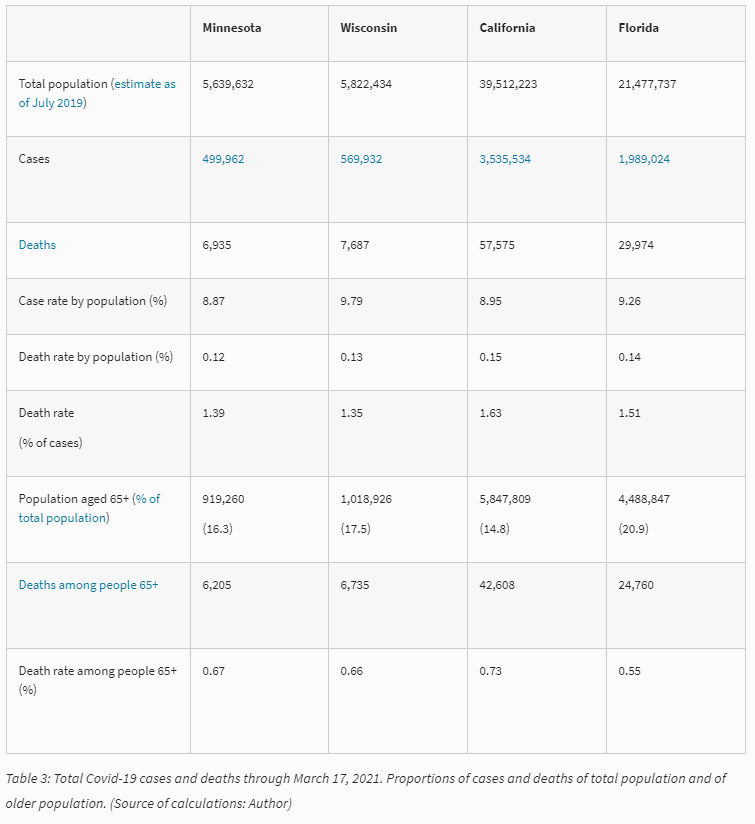 – Despite restrictions of differing severity and duration, there is little difference in the total number of COVID-19 infections and deaths across the four states, respectively, averaging around 9.22% and 0.14% of each state’s total population. The fatality rate is also comparable, although it is somewhat greater in California and Florida than in Minnesota and Wisconsin. This difference does not seem to be related to the regulations that were imposed.
