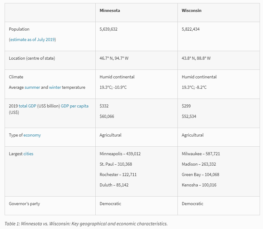 She gives a detailed timeline of the measures each state implemented, before summarising them, noting Minnesota imposed much stronger restrictions than Wisconsin.
