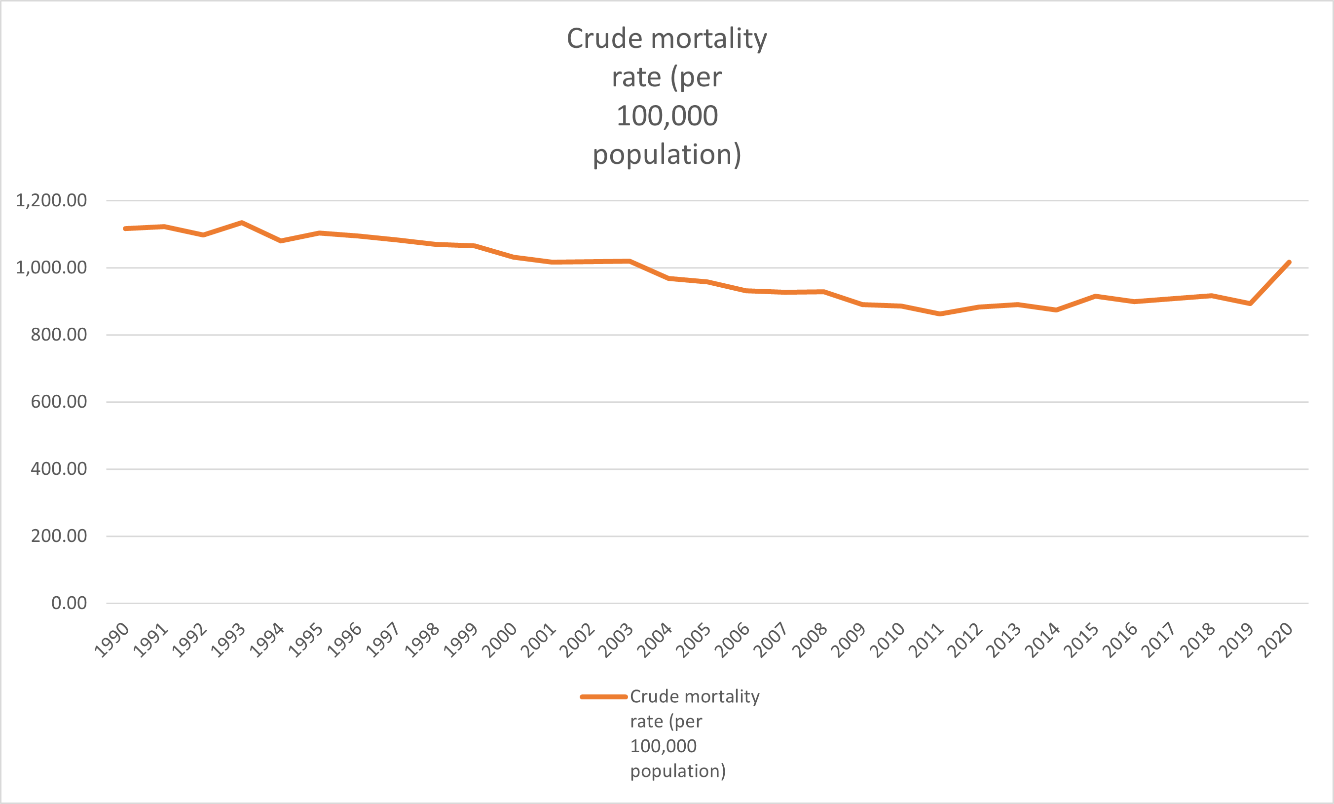The smoothed curve of UK mortality for the last quarter century describes a partial sine-wave. The important aspect of this is that, after reaching a nadir in the last ten years, the mortality trend rate was increasing again before the dip in 2019 and the compensation in 2020.